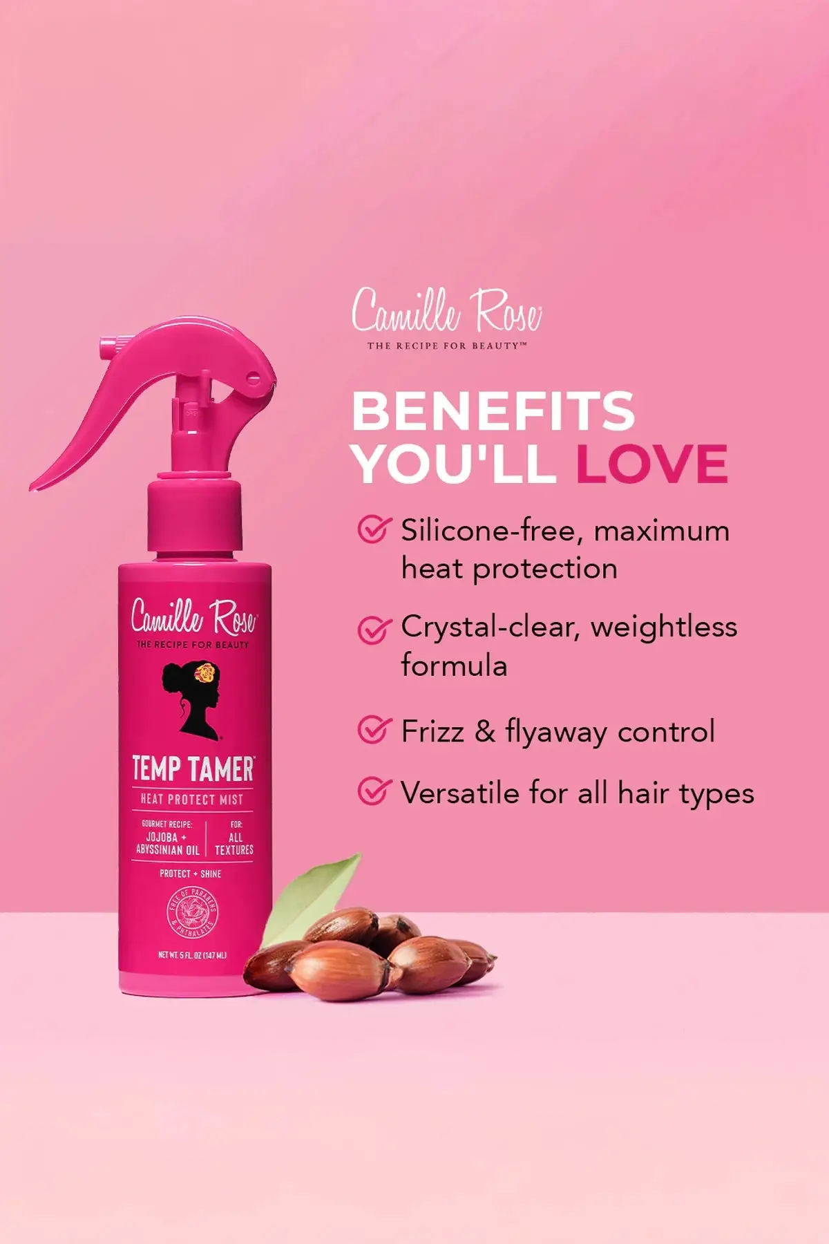 Protect, smooth, and shine with Camille Rose Temp Tamer Heat Protect Mist. This crystal-clear, silicone-free formula guards hair against heat styling while detangling, conditioning, and sealing strands for soft, frizz-free, salon-quality results. Perfect for blow-drying, flat-ironing, or curling all hair textures.