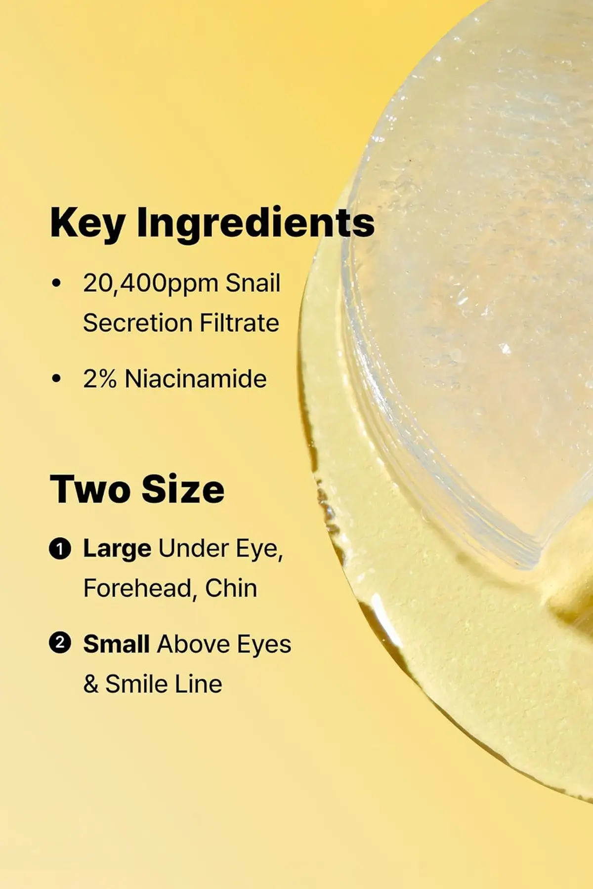 The innovative two-size design of the EYE PATCH ensures a perfect, comfortable fit for different face shapes and target areas. Powered by snail mucin, it helps smooth and soften skin texture while delivering targeted nourishment exactly where you need it most. Each EYE PATCH adheres effortlessly, allowing the essence to absorb deeply for maximum hydration and a refreshed, supple finish.